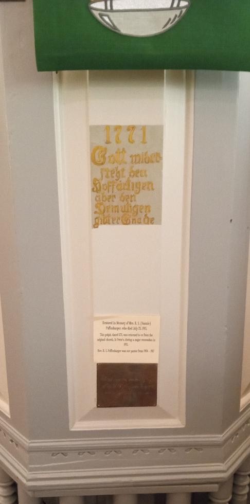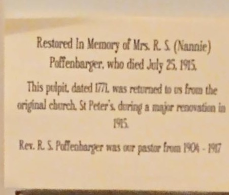 Plaque on restored pulpit in memory of Nannie Poffenbarger